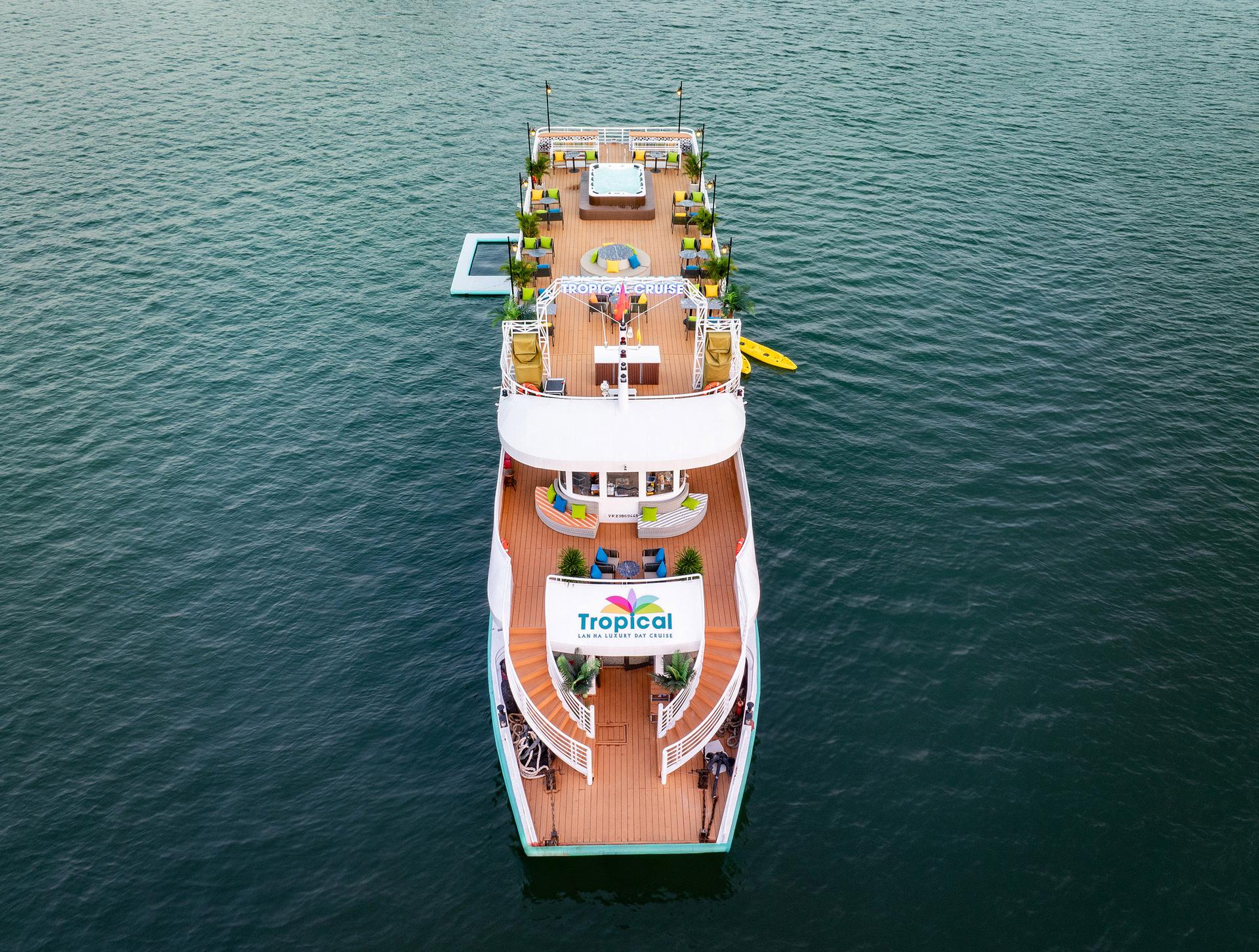 A 5-star Tropical Cruise takes you through emerald waters, dramatic limestone formations, and the tranquil green of Cat Ba in a fulfilling Lan Ha Bay 1 day journey. Ride an electric car through the island’s forest, explore Trung Trang Cave, visit the Natural History Museum, kayak and swim in Tra Bau, unwind in the Jacuzzi, then finish beautifully with a sunset party on the bay.