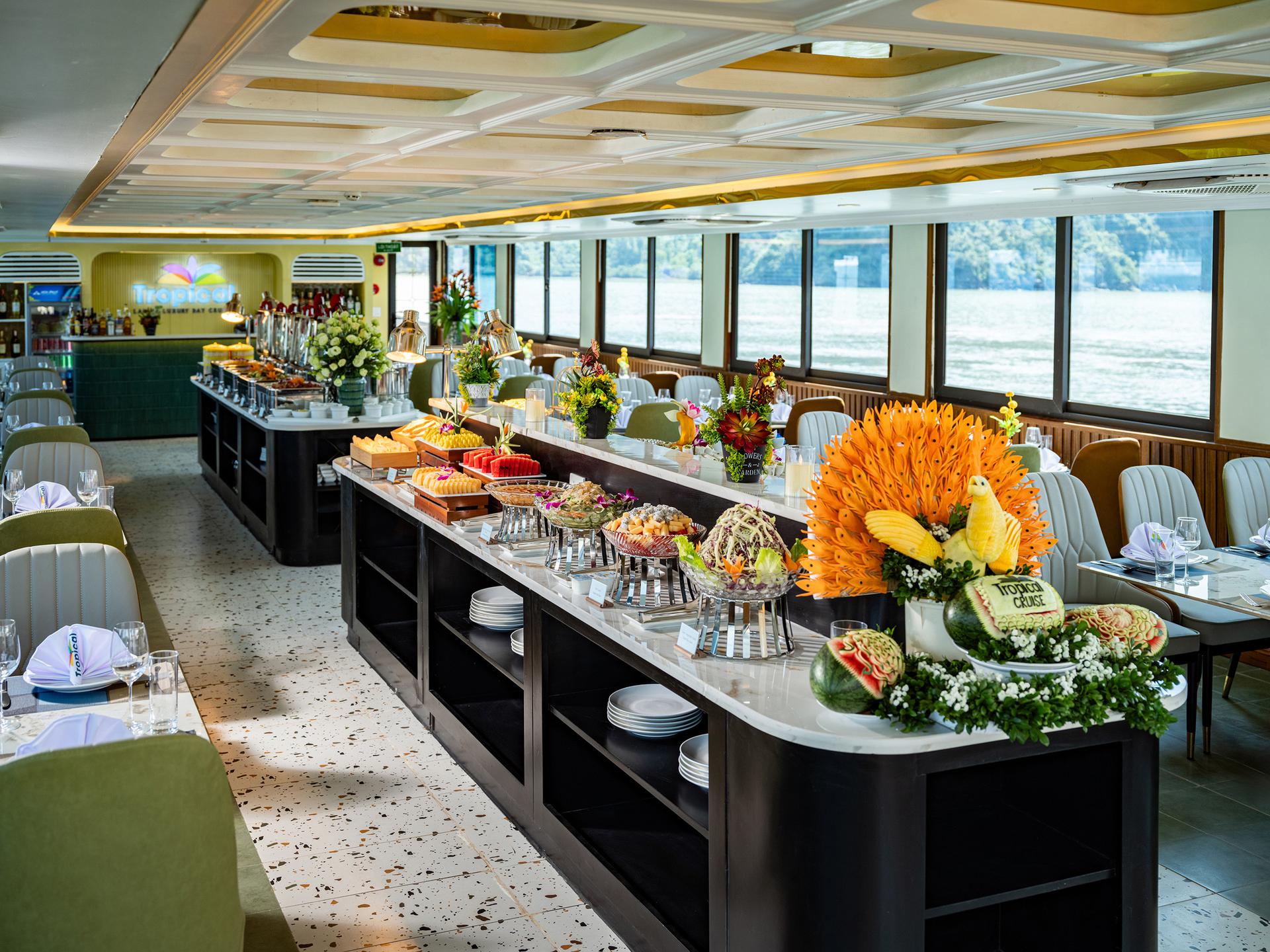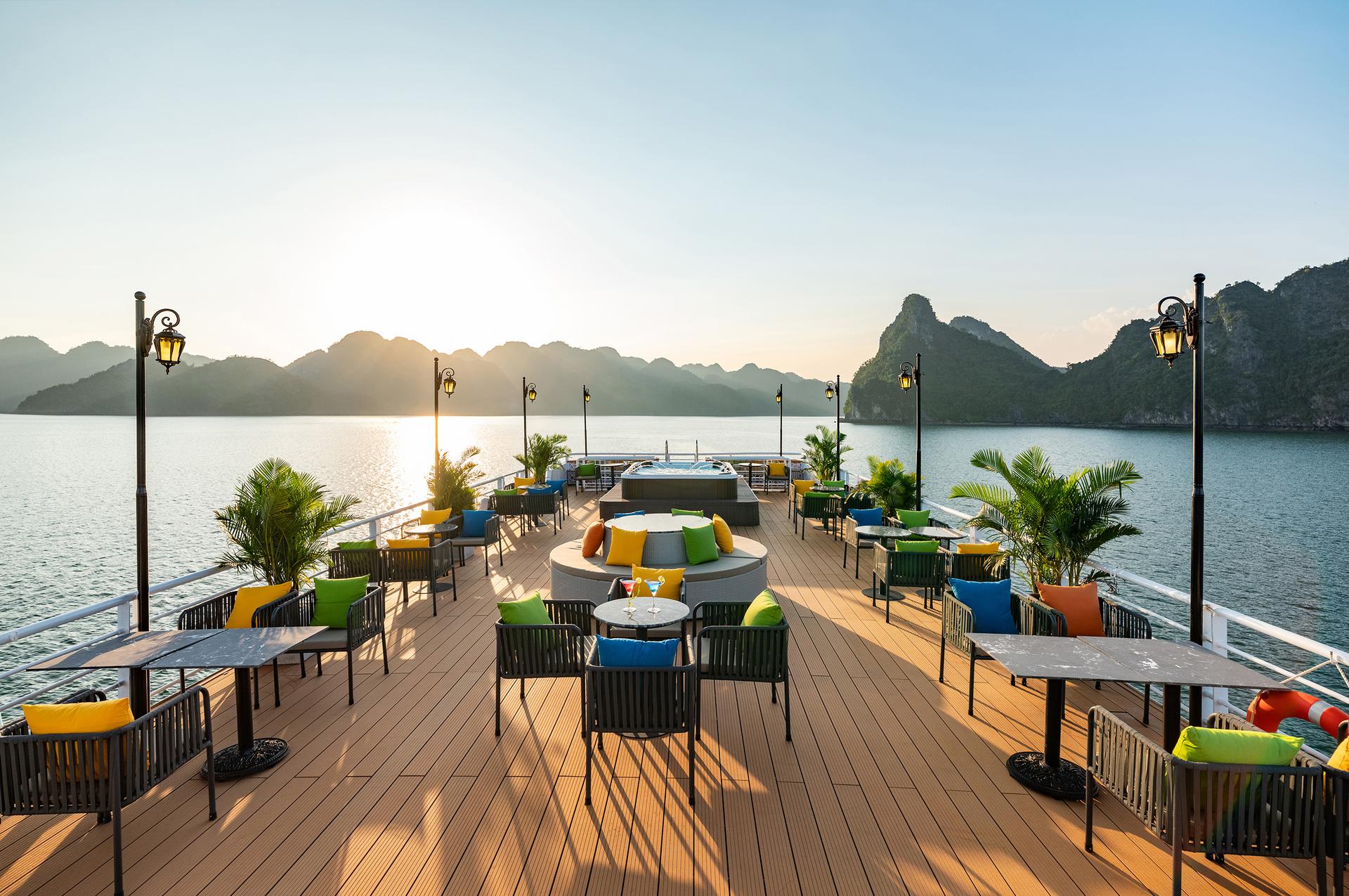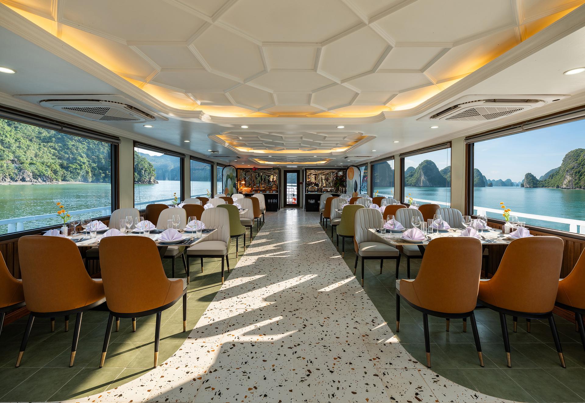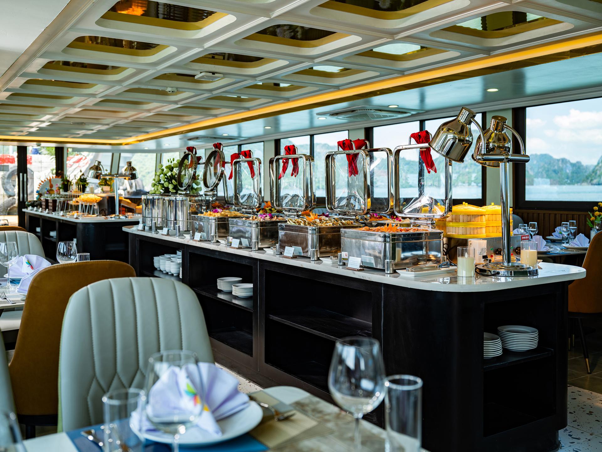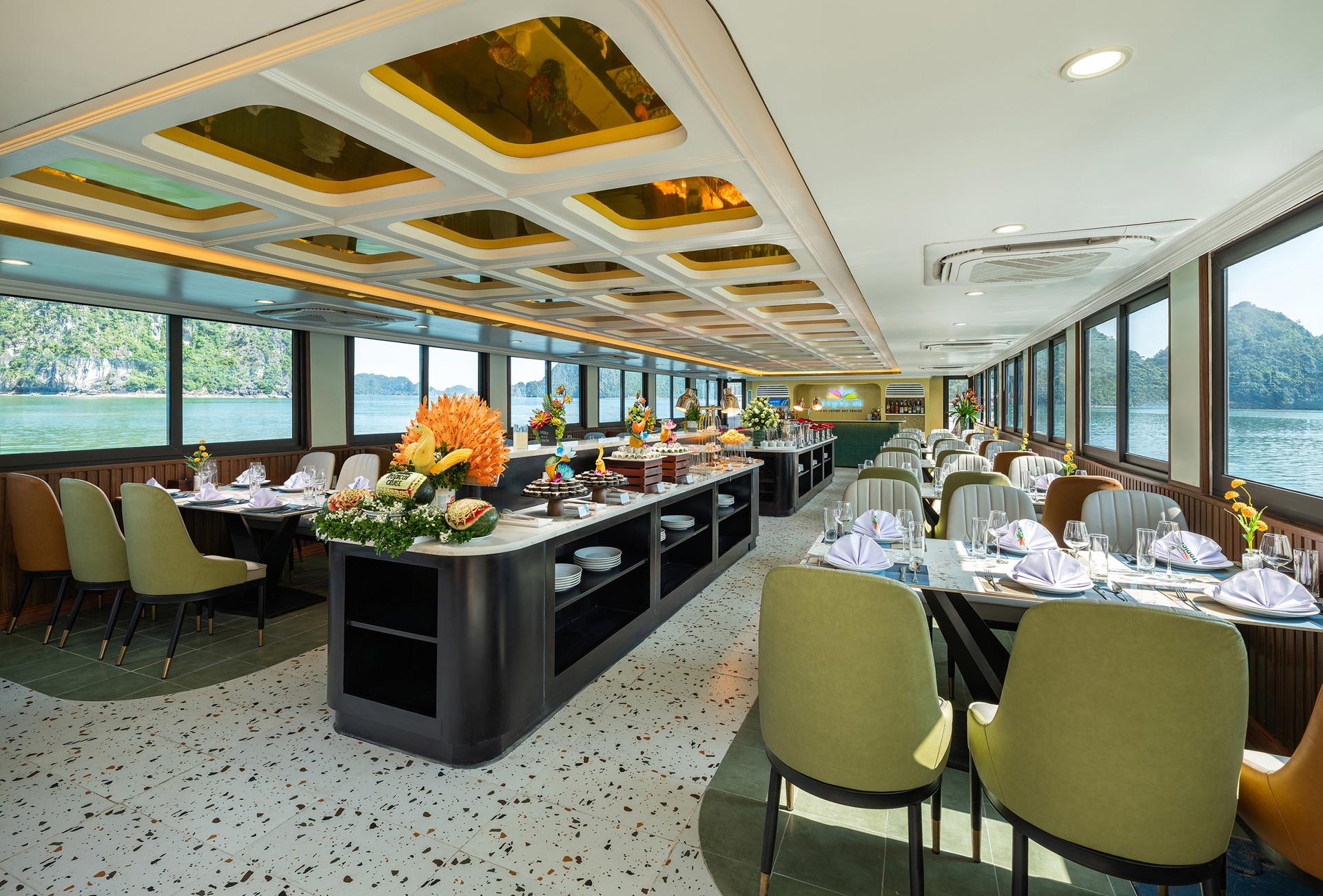 Enjoy premium seafood & local dishes while cruising into Lan Ha Bay.