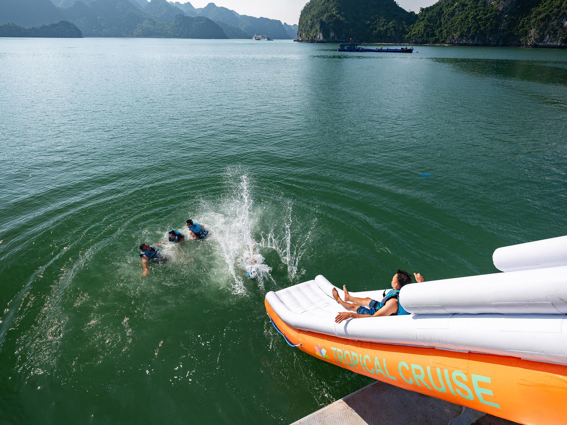Relax in the Jacuzzi, enjoy free swimming, slide into the sea, and have fun at the giant inflatable playground on the bay.